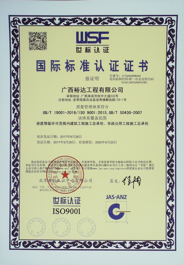 2017年9月7日至16日,经过专家组两轮现场审核,安博web版登录入口顺利通过了GB/T19001-2016《质量管理体系》、GB/T24001-2016《环境管理体系》、GB/T28001—2011《职业健康安全管理体系》、GB/T50430-2007《工程建设施工企业质量管理规范》三标一体的认证,并于2017年9月26日获得由北京世标认证中心有限公司颁发的ISO9001:2015、GB/T50430-2007、ISO14001:2015和GB/T 28001-2011的认证证书。