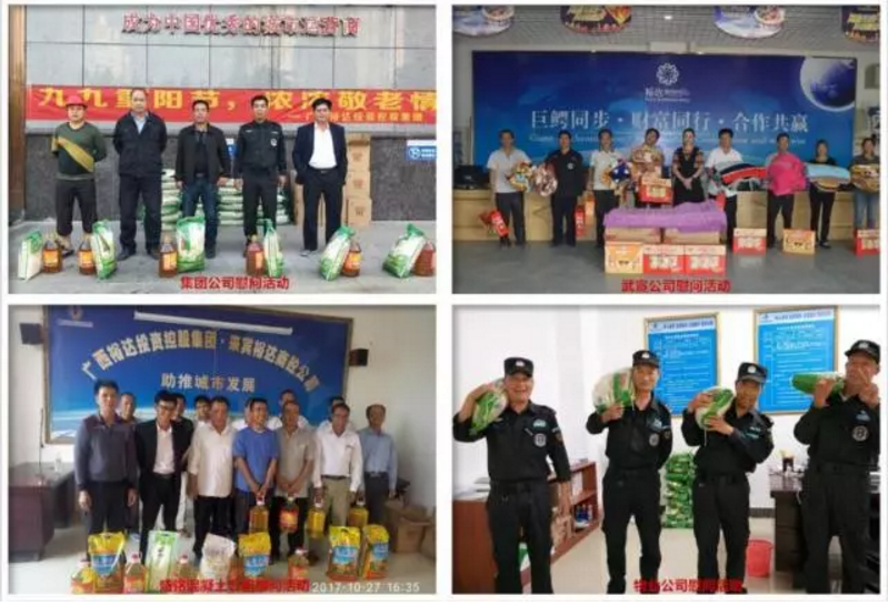 爱在重阳度金秋,乐享幸福桑榆景。在一年一度的九九重阳节到来之际,为肯定全集团年长员工的辛勤付出和贡献,度过一个温馨、快乐的重阳佳节,集团公司、武宣裕达房地产开发有限公司、广西盛铭混凝土有限公司、广西裕达集团物业服务有限公司等各子(分)公司开展了形式多样的慰问活动,为年长员工送上了满满的节日祝福。