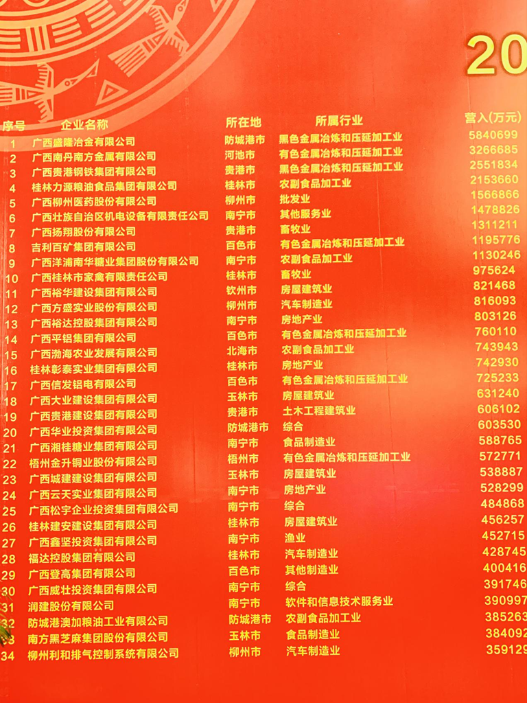 广西壮族自治区党委统战部副部长、自治区工商联党组书记卢能干表示:发布2021广西民营企业100强榜单,是为了总结成绩、比较发展、树立榜样,进一步引导、激励、促进广西民营企业健康发展。会上发布了《2021广西民营企业100强调研分析报告》,公布了2021广西民营企业100强、制造业100强、2021广西民营企业纳税10强、最具竞争力、最具潜力民营企业榜单。并为入围企业颁发荣誉证书进行表彰,裕达控股集团以803126万元的营业收入荣获2021年广西民营企业第13强!