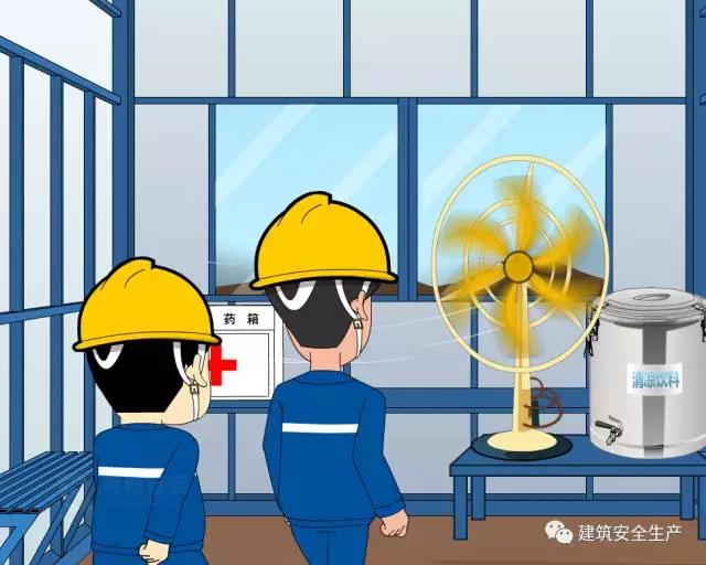 6、改善建筑工地生产生活环境。要认真落实建筑施工现场管理规定,加强通风降温,确保施工人员宿舍、食堂、厕所、淋浴间等临时设施满足防暑降温需要。建筑工地施工现场的宿舍和食堂安装电扇,条件允许时,在宿舍安装空调。