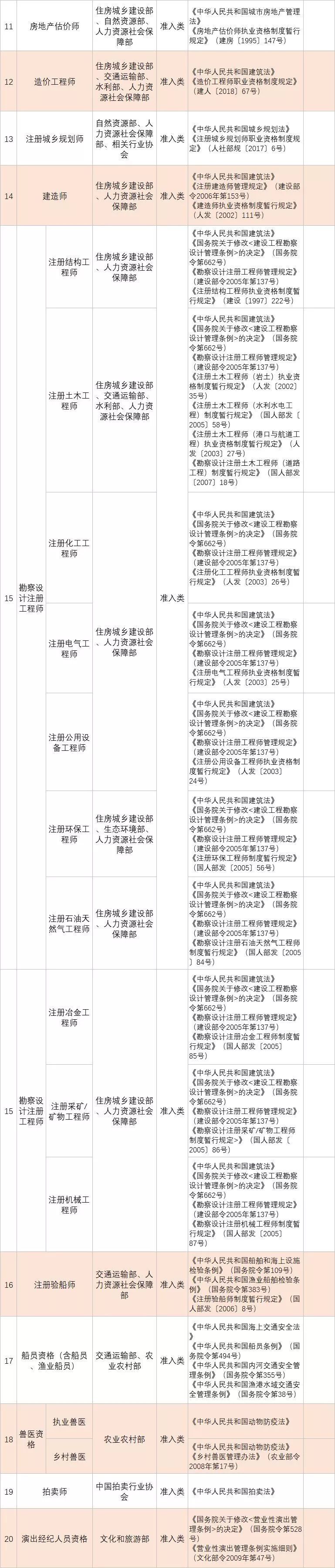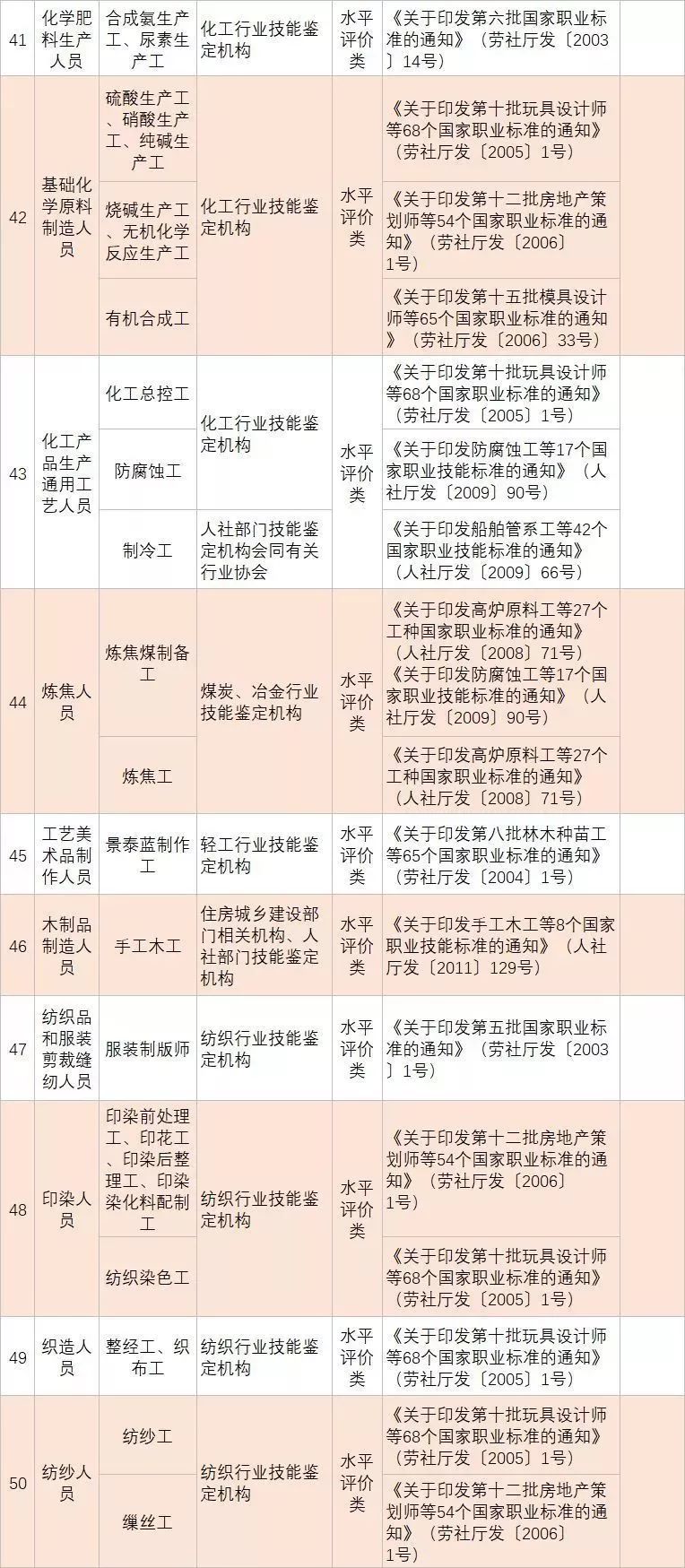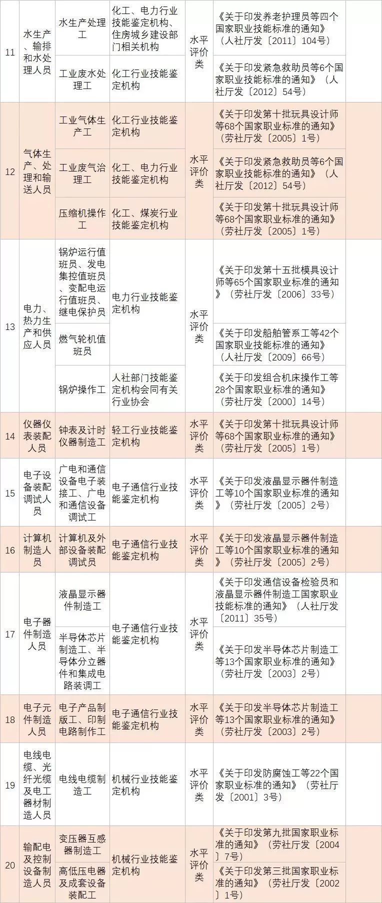 (四)深化技能人员职业资格制度改革。巩固职业资格改革成果,完善国家职业资格目录。对准入类职业资格,继续保留在国家职业资格目录内。对关系公共利益或涉及国家安全、公共安全、人身健康、生命财产安全的水平评价类职业资格,要依法依规转为准入类职业资格。对与国家安全、公共安全、人身健康、生命财产安全关系不密切的水平评价类职业资格,要逐步调整退出目录,对其中社会通用性强、专业性强、技术技能要求高的职业(工种),可根据经济社会发展需要,实行职业技能等级认定。
