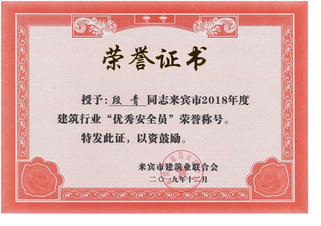 段青来宾市2018年度建筑行业“优秀建造师”荣誉称号